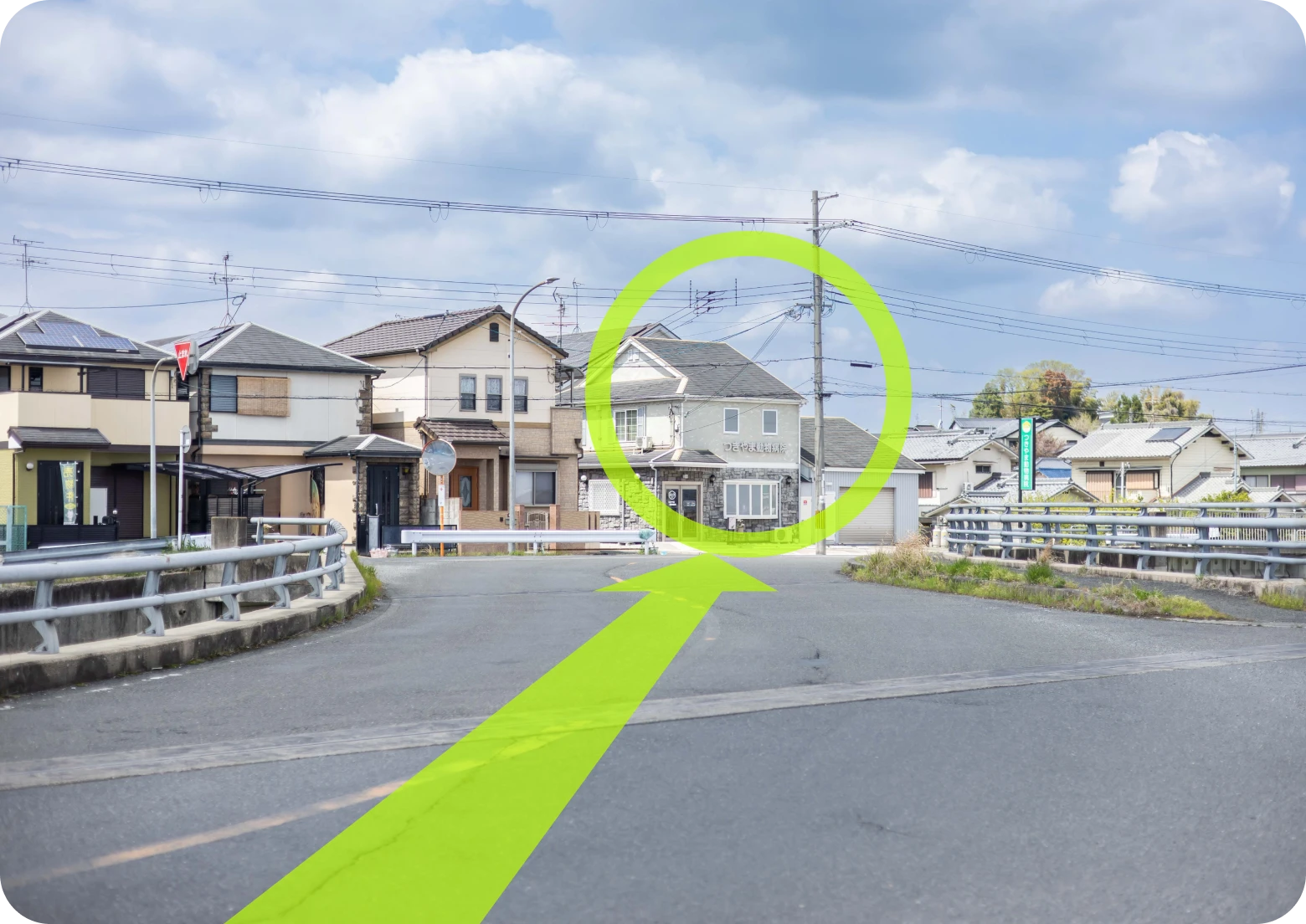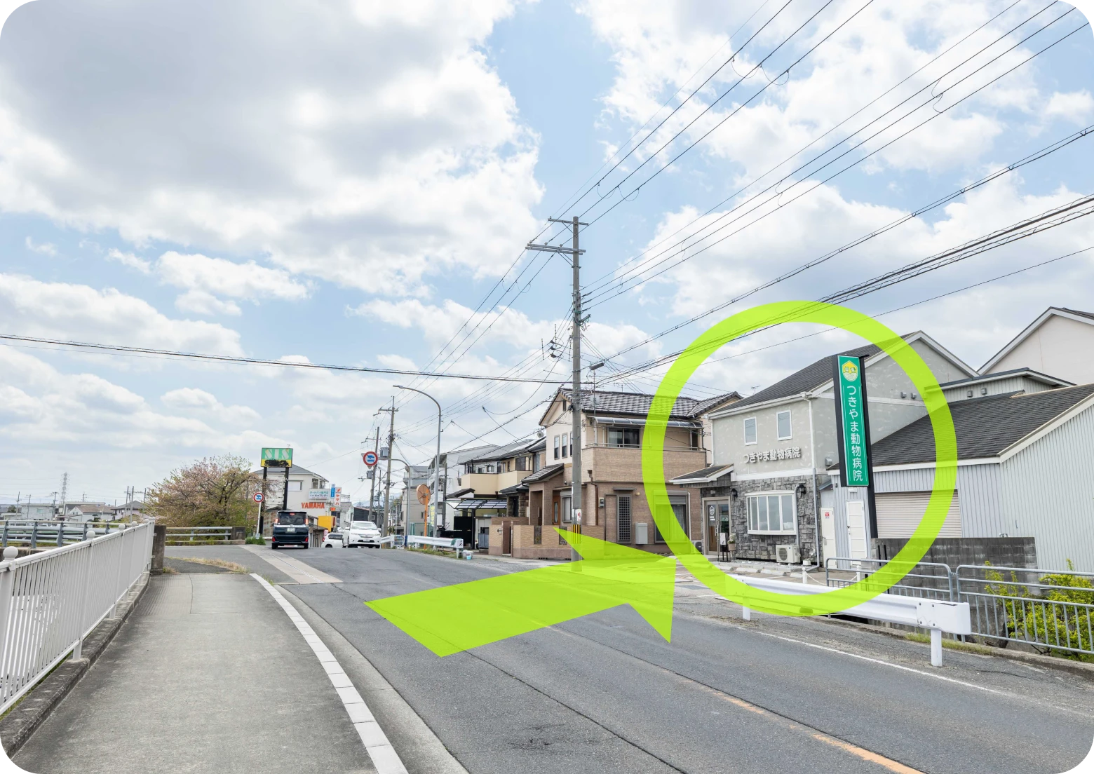国道165号線で「築山」交差点を北上し、高田川沿いに進みます。しばらく進むと川を渡るY字路がありますので、そちらを渡ってすぐ左手に当院がございます。